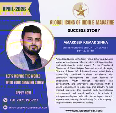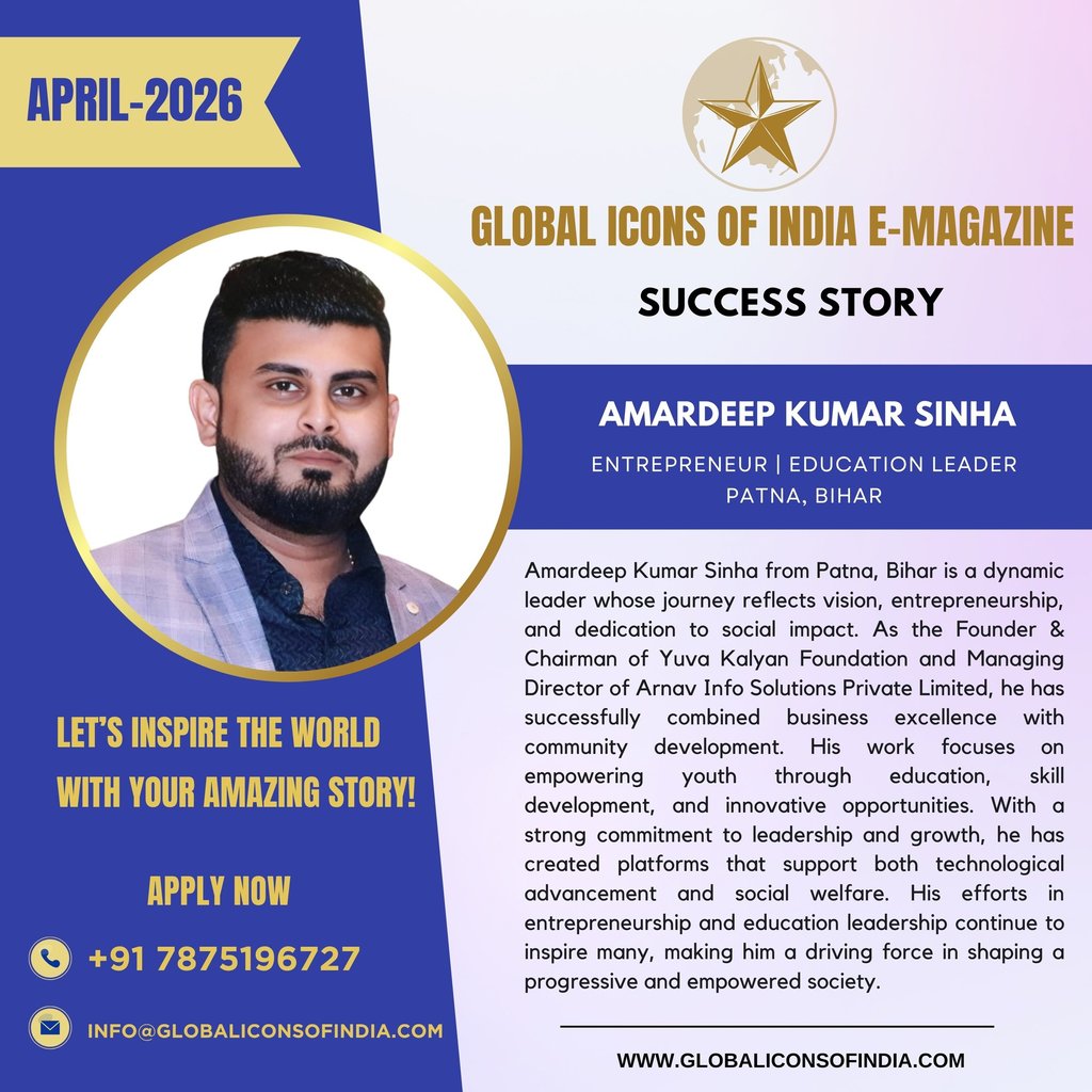 Amardeep Kumar Sinha from Patna, Bihar is a dynamic leader whose journey reflects vision, entrepreneurship, and dedication to social impact. As the Founder & Chairman of Yuva Kalyan Foundation and Managing Director of Arnav Info Solutions Private Limited, he has successfully combined business excellence with community development. His work focuses on empowering youth through education, skill development, and innovative opportunities. With a strong commitment to leadership and growth, he has created platforms that support both technological advancement and social welfare. His efforts in entrepreneurship and education leadership continue to inspire many, making him a driving force in shaping a progressive and empowered society.