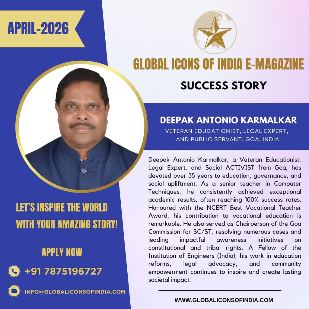 Deepak Antonio Karmalkar, a Veteran Educationist, Legal Expert, and Social ACTIVIST from Goa, has devoted over 35 years to education, governance, and social upliftment. As a senior teacher in Computer Techniques, he consistently achieved exceptional academic results, often reaching 100% success rates. Honoured with the NCERT Best Vocational Teacher Award, his contribution to vocational education is remarkable. He also served as Chairperson of the Goa Commission for SC/ST, resolving numerous cases and leading impactful awareness initiatives on constitutional and tribal rights. A Fellow of the Institution of Engineers (India), his work in education reforms, legal advocacy, and community empowerment continues to inspire and create lasting societal impact.