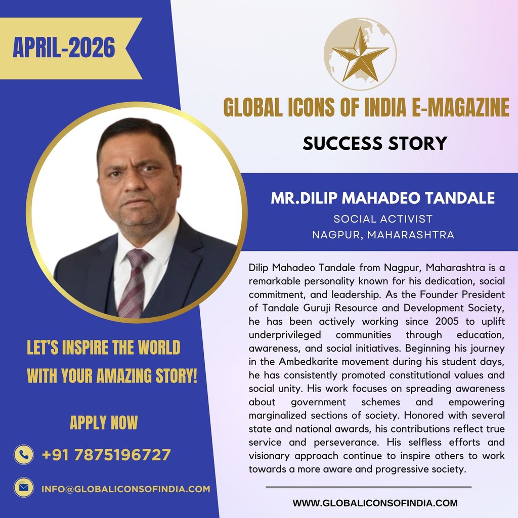 Dilip Mahadeo Tandale from Nagpur, Maharashtra is a remarkable personality known for his dedication, social commitment, and leadership. As the Founder President of Tandale Guruji Resource and Development Society, he has been actively working since 2005 to uplift underprivileged communities through education, awareness, and social initiatives. Beginning his journey in the Ambedkarite movement during his student days, he has consistently promoted constitutional values and social unity. His work focuses on spreading awareness about government schemes and empowering marginalized sections of society. Honored with several state and national awards, his contributions reflect true service and perseverance. His selfless efforts and visionary approach continue to inspire others to work towards a more aware and progressive society.