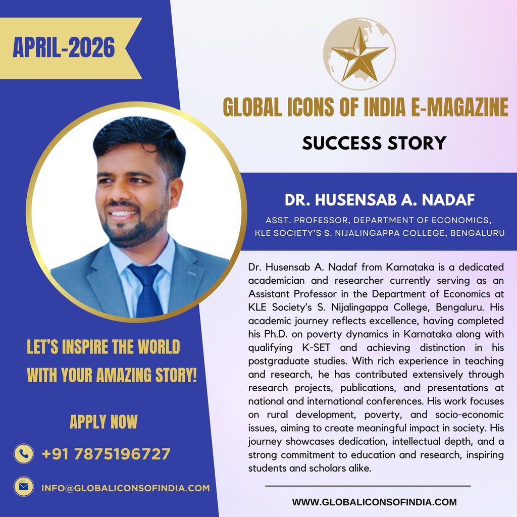 Dr. Husensab A. Nadaf from Karnataka is a dedicated academician and researcher currently serving as an Assistant Professor in the Department of Economics at KLE Society’s S. Nijalingappa College, Bengaluru. His academic journey reflects excellence, having completed his Ph.D. on poverty dynamics in Karnataka along with qualifying K-SET and achieving distinction in his postgraduate studies. With rich experience in teaching and research, he has contributed extensively through research projects, publications, and presentations at national and international conferences. His work focuses on rural development, poverty, and socio-economic issues, aiming to create meaningful impact in society. His journey showcases dedication, intellectual depth, and a strong commitment to education and research, inspiring students and scholars alike.