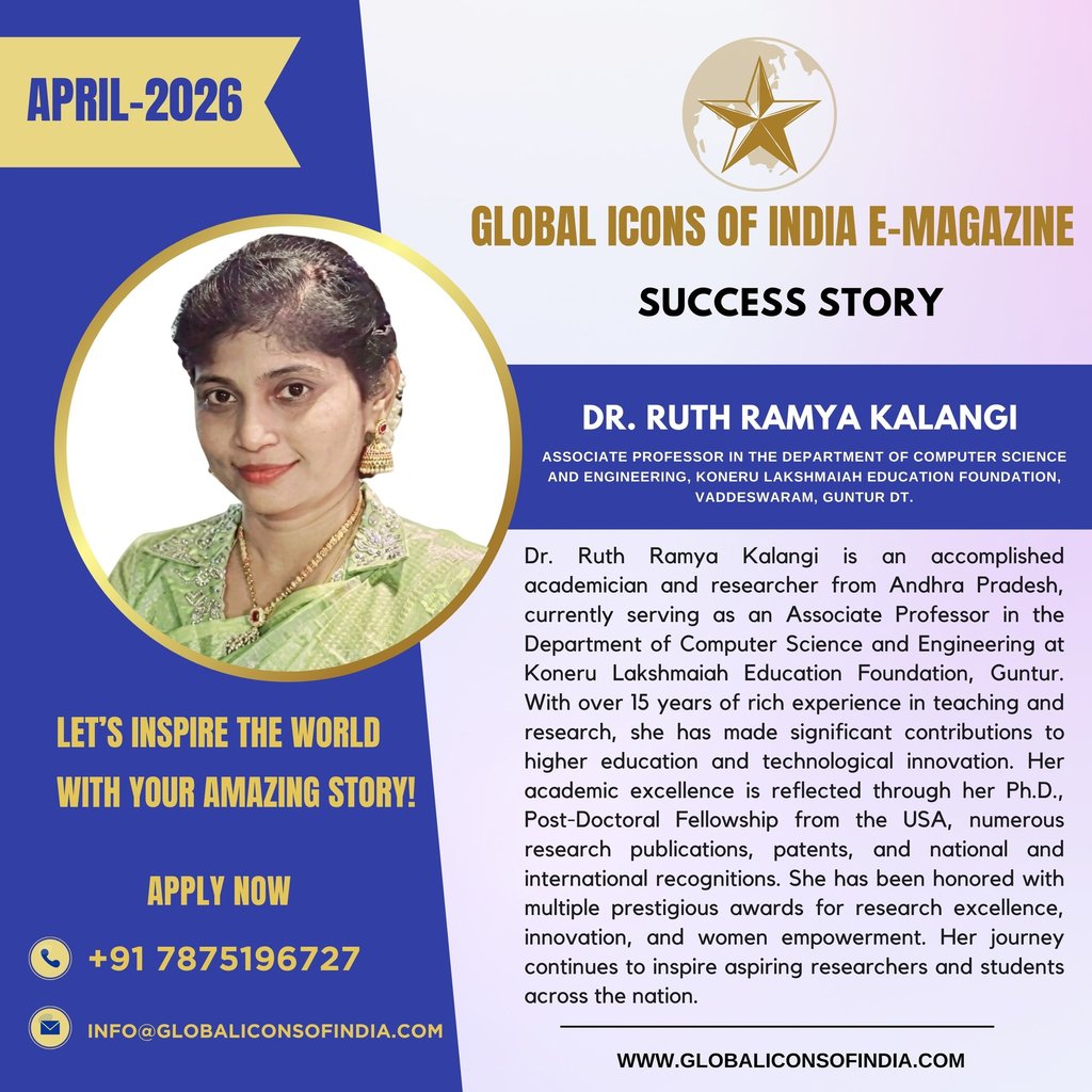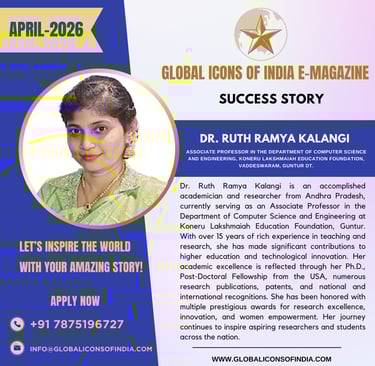 Dr. Ruth Ramya Kalangi is an accomplished academician and researcher from Andhra Pradesh, currently serving as an Associate Professor in the Department of Computer Science and Engineering at Koneru Lakshmaiah Education Foundation, Guntur. With over 15 years of rich experience in teaching and research, she has made significant contributions to higher education and technological innovation. Her academic excellence is reflected through her Ph.D., Post-Doctoral Fellowship from the USA, numerous research publications, patents, and national and international recognitions. She has been honored with multiple prestigious awards for research excellence, innovation, and women empowerment. Her journey continues to inspire aspiring researchers and students across the nation.