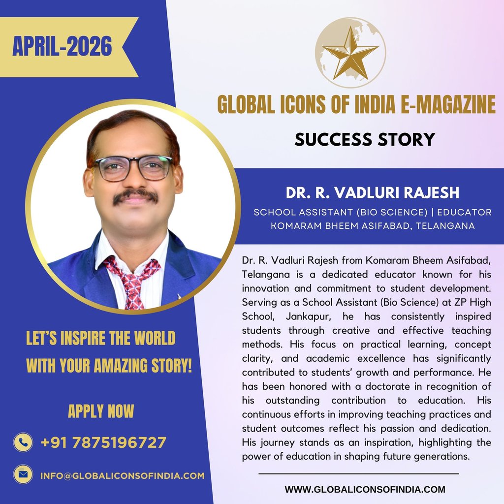 Dr. R. Vadluri Rajesh from Komaram Bheem Asifabad, Telangana is a dedicated educator known for his innovation and commitment to student development. Serving as a School Assistant (Bio Science) at ZP High School, Jankapur, he has consistently inspired students through creative and effective teaching methods. His focus on practical learning, concept clarity, and academic excellence has significantly contributed to students’ growth and performance. He has been honored with a doctorate in recognition of his outstanding contribution to education. His continuous efforts in improving teaching practices and student outcomes reflect his passion and dedication. His journey stands as an inspiration, highlighting the power of education in shaping future generations.