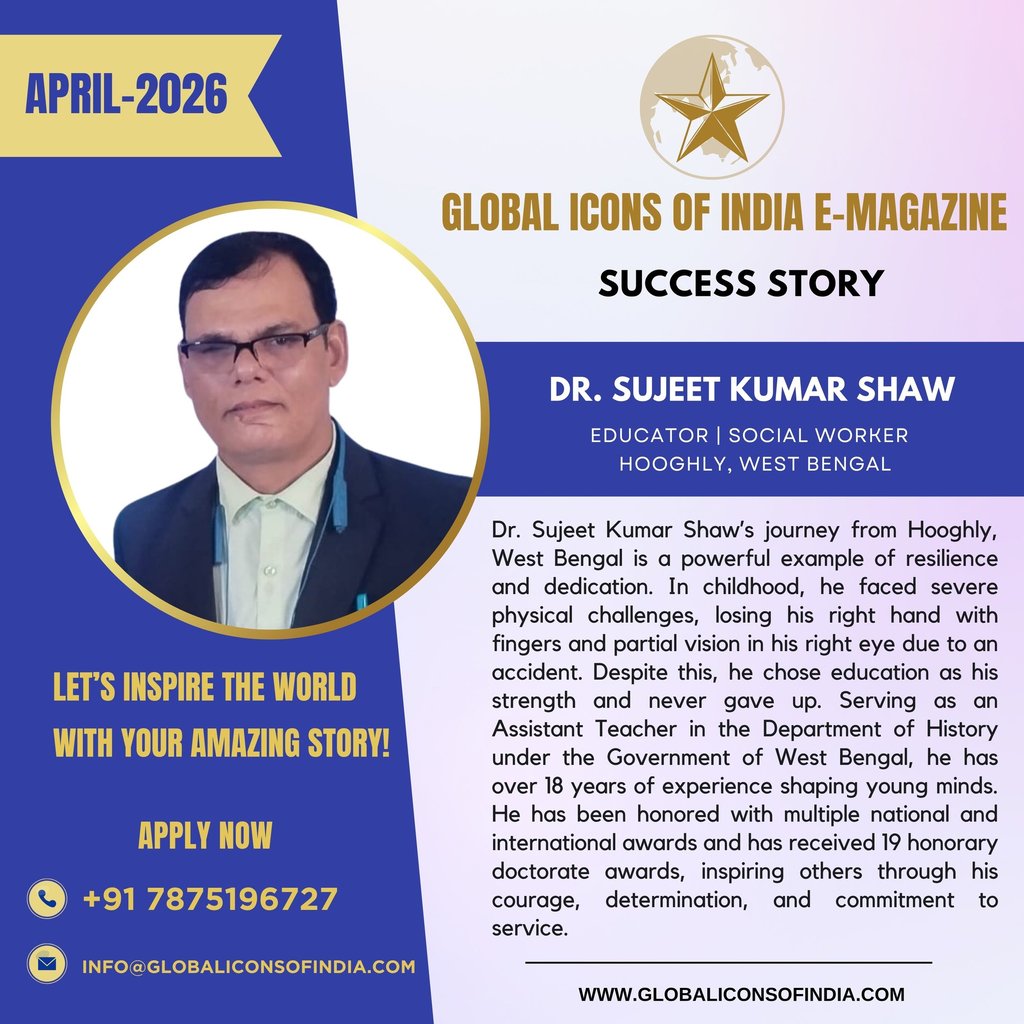 Dr. Sujeet Kumar Shaw’s journey from Hooghly, West Bengal is a powerful example of resilience and dedication. In childhood, he faced severe physical challenges, losing his right hand with fingers and partial vision in his right eye due to an accident. Despite this, he chose education as his strength and never gave up. Serving as an Assistant Teacher in the Department of History under the Government of West Bengal, he has over 18 years of experience shaping young minds. He has been honored with multiple national and international awards and has received 19 honorary doctorate awards, inspiring others through his courage, determination, and commitment to service.