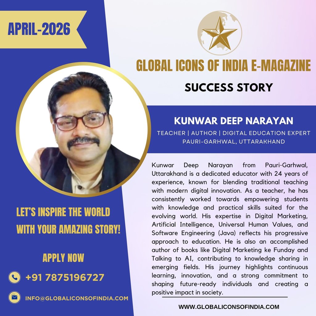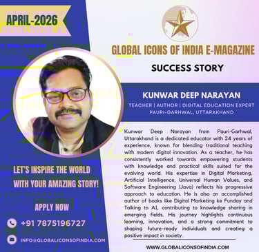 Kunwar Deep Narayan from Pauri-Garhwal, Uttarakhand is a dedicated educator with 24 years of experience, known for blending traditional teaching with modern digital innovation. As a teacher, he has consistently worked towards empowering students with knowledge and practical skills suited for the evolving world. His expertise in Digital Marketing, Artificial Intelligence, Universal Human Values, and Software Engineering (Java) reflects his progressive approach to education. He is also an accomplished author of books like Digital Marketing ke Funday and Talking to AI, contributing to knowledge sharing in emerging fields. His journey highlights continuous learning, innovation, and a strong commitment to shaping future-ready individuals and creating a positive impact in society.