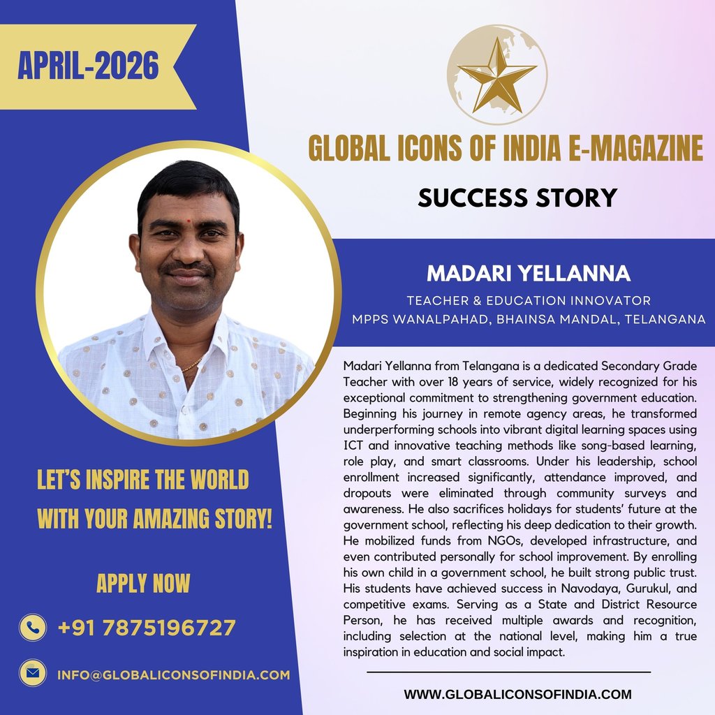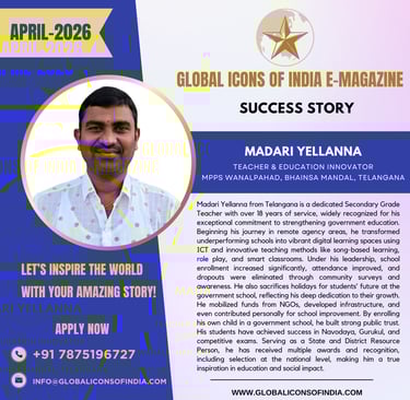 Madari Yellanna from Telangana is a dedicated Secondary Grade Teacher with over 18 years of service, widely recognized for his exceptional commitment to strengthening government education. Beginning his journey in remote agency areas, he transformed underperforming schools into vibrant digital learning spaces using ICT and innovative teaching methods like song-based learning, role play, and smart classrooms. Under his leadership, school enrollment increased significantly, attendance improved, and dropouts were eliminated through community surveys and awareness. He also sacrifices holidays for students’ future at the government school, reflecting his deep dedication to their growth. He mobilized funds from NGOs, developed infrastructure, and even contributed personally for school improvement. By enrolling his own child in a government school, he built strong public trust. His students have achieved success in Navodaya, Gurukul, and competitive exams. Serving as a State and District Resource Person, he has received multiple awards and recognition, including selection at the national level, making him a true inspiration in education and social impact.