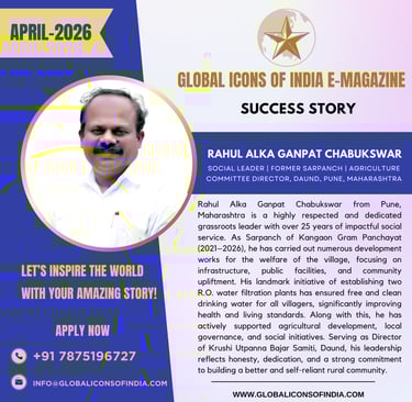 Rahul Alka Ganpat Chabukswar from Pune, Maharashtra is a highly respected and dedicated grassroots leader with over 25 years of impactful social service. As Sarpanch of Kangaon Gram Panchayat (2021–2026), he has carried out numerous development works for the welfare of the village, focusing on infrastructure, public facilities, and community upliftment. His landmark initiative of establishing two R.O. water filtration plants has ensured free and clean drinking water for all villagers, significantly improving health and living standards. Along with this, he has actively supported agricultural development, local governance, and social initiatives. Serving as Director of Krushi Utpanna Bajar Samiti, Daund, his leadership reflects honesty, dedication, and a strong commitment to building a better and self-reliant rural community.