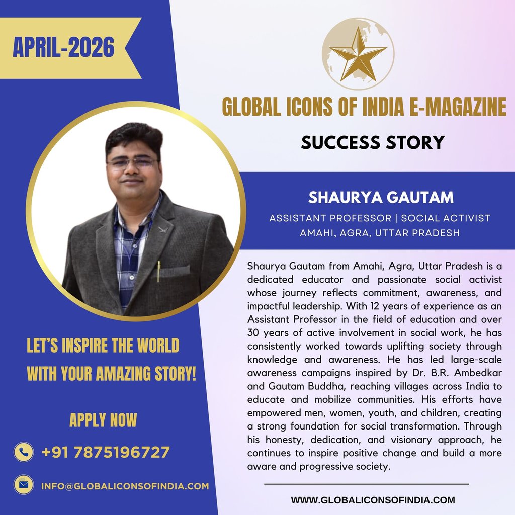 Shaurya Gautam from Amahi, Agra, Uttar Pradesh is a dedicated educator and passionate social activist whose journey reflects commitment, awareness, and impactful leadership. With 12 years of experience as an Assistant Professor in the field of education and over 30 years of active involvement in social work, he has consistently worked towards uplifting society through knowledge and awareness. He has led large-scale awareness campaigns inspired by Dr. B.R. Ambedkar and Gautam Buddha, reaching villages across India to educate and mobilize communities. His efforts have empowered men, women, youth, and children, creating a strong foundation for social transformation. Through his honesty, dedication, and visionary approach, he continues to inspire positive change and build a more aware and progressive society.