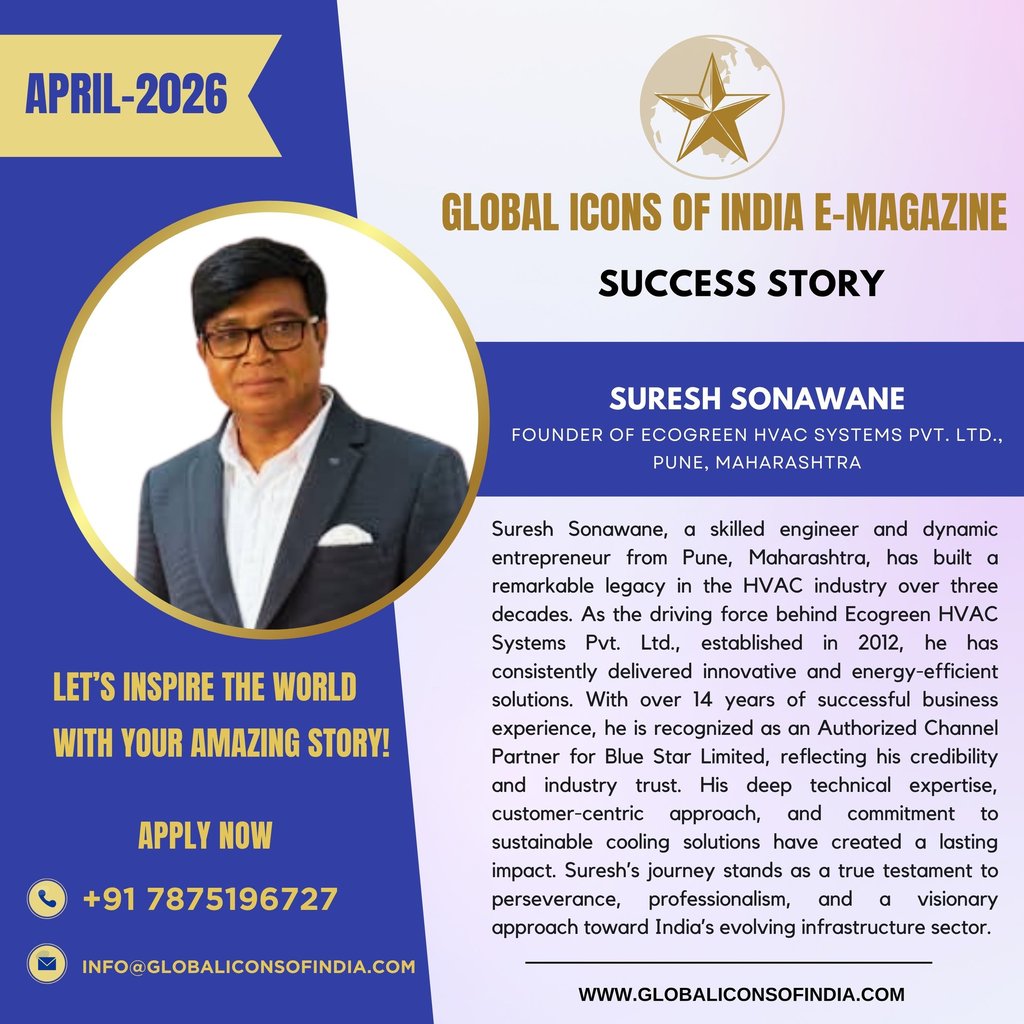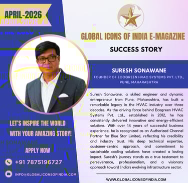Suresh Sonawane, a skilled engineer and dynamic entrepreneur from Pune, Maharashtra, has built a remarkable legacy in the HVAC industry over three decades. As the driving force behind Ecogreen HVAC Systems Pvt. Ltd., established in 2012, he has consistently delivered innovative and energy-efficient solutions. With over 14 years of successful business experience, he is recognized as an Authorized Channel Partner for Blue Star Limited, reflecting his credibility and industry trust. His deep technical expertise, customer-centric approach, and commitment to sustainable cooling solutions have created a lasting impact. Suresh’s journey stands as a true testament to perseverance, professionalism, and a visionary approach toward India’s evolving infrastructure sector.