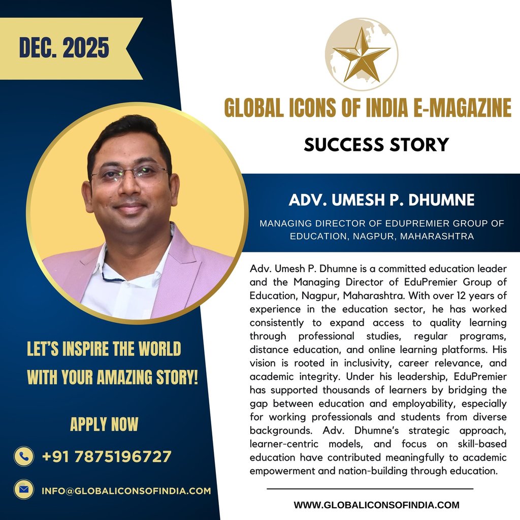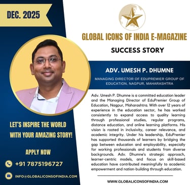 Adv. Umesh P. Dhumne is a committed education leader and the Managing Director of EduPremier Group of Education, Nagpur, Maharashtra. With over 12 years of experience in the education sector, he has worked consistently to expand access to quality learning through professional studies, regular programs, distance education, and online learning platforms. His vision is rooted in inclusivity, career relevance, and academic integrity. Under his leadership, EduPremier has supported thousands of learners by bridging the gap between education and employability, especially for working professionals and students from diverse backgrounds. Adv. Dhumne’s strategic approach, learner-centric models, and focus on skill-based education have contributed meaningfully to academic empowerment and nation-building through education.