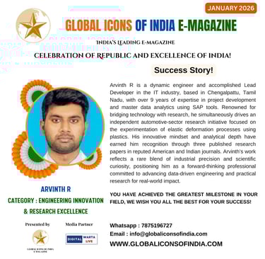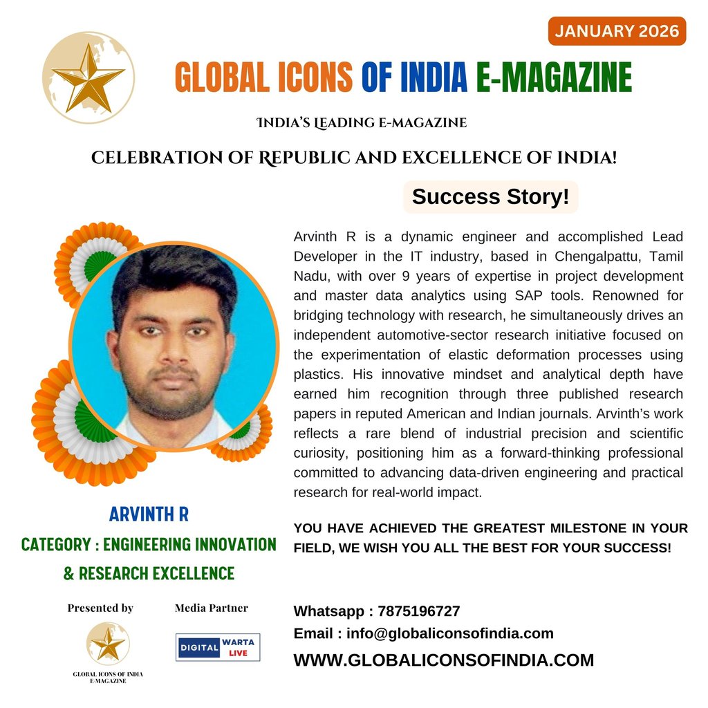 Arvinth R is a dynamic engineer and accomplished Lead Developer in the IT industry, based in Chengalpattu, Tamil Nadu, with over 9 years of expertise in project development and master data analytics using SAP tools. Renowned for bridging technology with research, he simultaneously drives an independent automotive-sector research initiative focused on the experimentation of elastic deformation processes using plastics. His innovative mindset and analytical depth have earned him recognition through three published research papers in reputed American and Indian journals. Arvinth’s work reflects a rare blend of industrial precision and scientific curiosity, positioning him as a forward-thinking professional committed to advancing data-driven engineering and practical research for real-world impact.