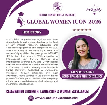 Arzoo Sahni, a passionate legal scholar from Chandigarh, is actively contributing to the field of law through research, education, and academic engagement. She completed her LL.B. from the Faculty of Law, University of Delhi, and successfully qualified the prestigious UGC-NET JRF in her first attempt. With expertise in International Law, Cultural Heritage Law, International Criminal Law, and Constitutional Law, she has worked as a Junior Research Fellow at IIT Kharagpur and is currently associated with Panjab University. Dedicated to empowering individuals through education and legal awareness, Arzoo believes in the transformative power of knowledge and strives to inspire young minds toward confidence, critical thinking, and meaningful social change.