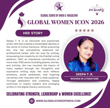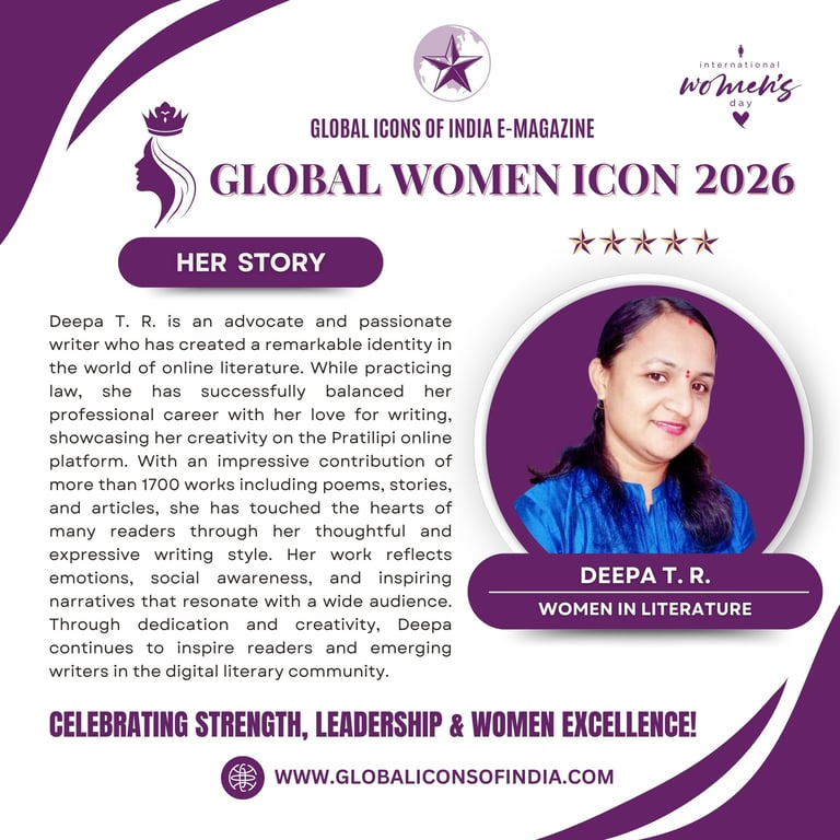 Deepa T. R. is an advocate and passionate writer who has created a remarkable identity in the world of online literature. While practicing law, she has successfully balanced her professional career with her love for writing, showcasing her creativity on the Pratilipi online platform. With an impressive contribution of more than 1700 works including poems, stories, and articles, she has touched the hearts of many readers through her thoughtful and expressive writing style. Her work reflects emotions, social awareness, and inspiring narratives that resonate with a wide audience. Through dedication and creativity, Deepa continues to inspire readers and emerging writers in the digital literary community.