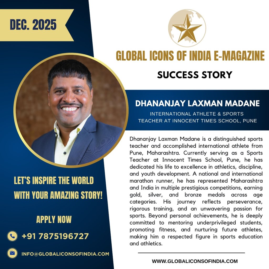 Dhananjay Laxman Madane is a distinguished sports teacher and accomplished international athlete from Pune, Maharashtra. Currently serving as a Sports Teacher at Innocent Times School, Pune, he has dedicated his life to excellence in athletics, discipline, and youth development. A national and international marathon runner, he has represented Maharashtra and India in multiple prestigious competitions, earning gold, silver, and bronze medals across age categories. His journey reflects perseverance, rigorous training, and an unwavering passion for sports. Beyond personal achievements, he is deeply committed to mentoring underprivileged students, promoting fitness, and nurturing future athletes, making him a respected figure in sports education and athletics.