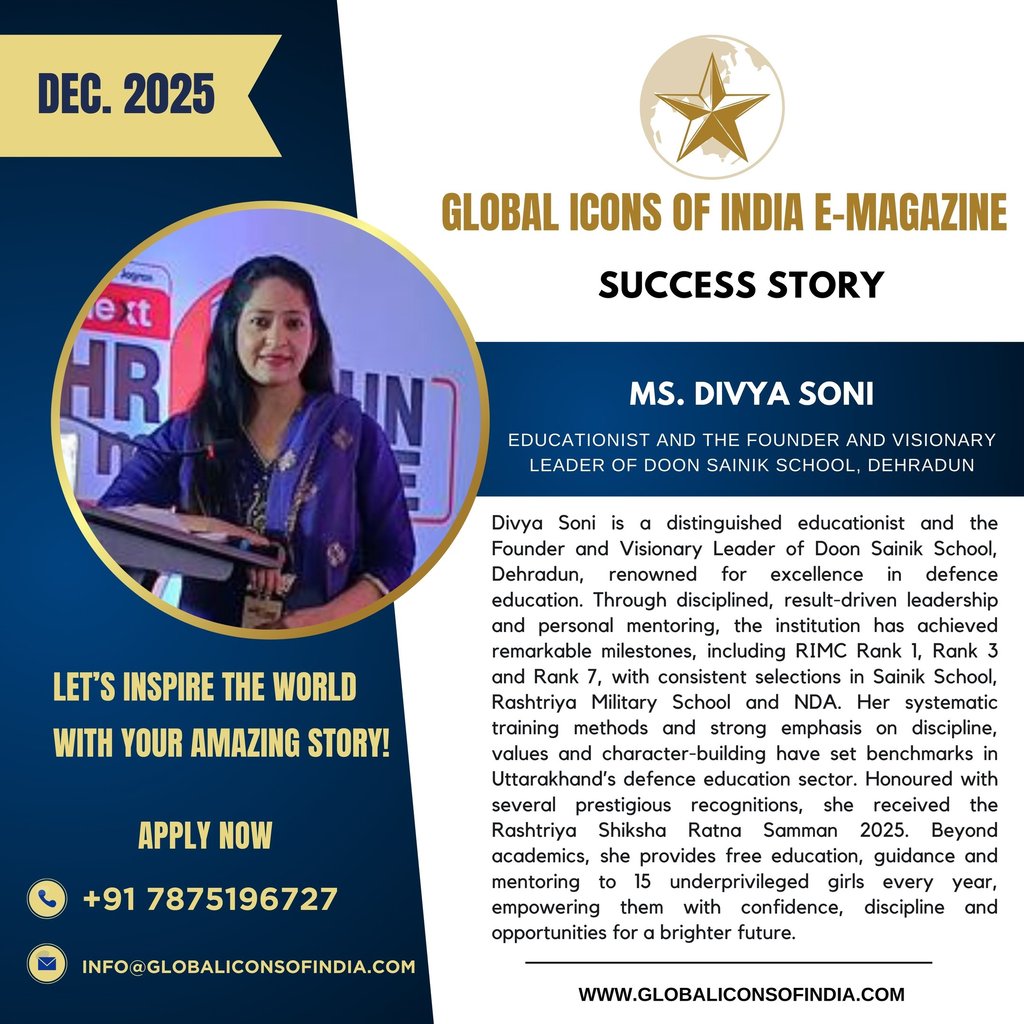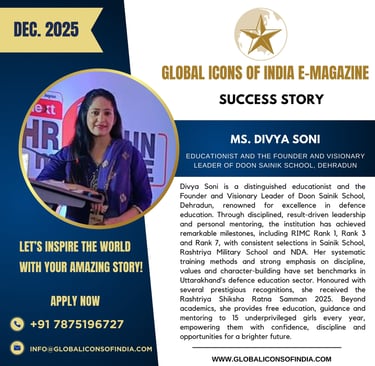 Divya Soni is a distinguished educationist and the Founder and Visionary Leader of Doon Sainik School, Dehradun, renowned for excellence in defence education. Through disciplined, result-driven leadership and personal mentoring, the institution has achieved remarkable milestones, including RIMC Rank 1, Rank 3 and Rank 7, with consistent selections in Sainik School, Rashtriya Military School and NDA. Her systematic training methods and strong emphasis on discipline, values and character-building have set benchmarks in Uttarakhand’s defence education sector. Honoured with several prestigious recognitions, she received the Rashtriya Shiksha Ratna Samman 2025. Beyond academics, she provides free education, guidance and mentoring to 15 underprivileged girls every year, empowering them with confidence, discipline and opportunities for a brighter future.