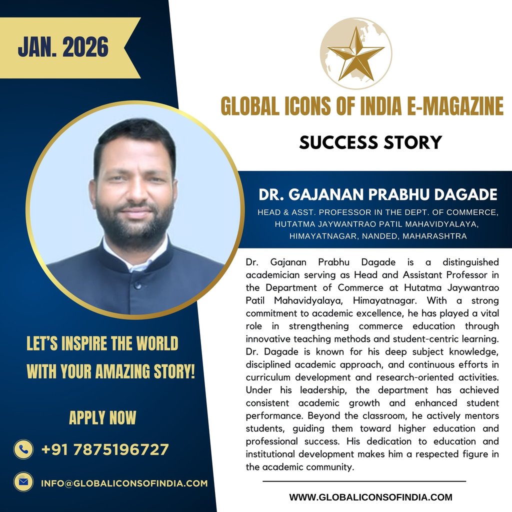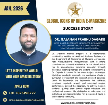 Dr. Gajanan Prabhu Dagade is a distinguished academician serving as Head and Assistant Professor in the Department of Commerce at Hutatma Jaywantrao Patil Mahavidyalaya, Himayatnagar. With a strong commitment to academic excellence, he has played a vital role in strengthening commerce education through innovative teaching methods and student-centric learning. Dr. Dagade is known for his deep subject knowledge, disciplined academic approach, and continuous efforts in curriculum development and research-oriented activities. Under his leadership, the department has achieved consistent academic growth and enhanced student performance. Beyond the classroom, he actively mentors students, guiding them toward higher education and professional success. His dedication to education and institutional development makes him a respected figure in the academic community.
