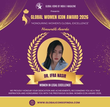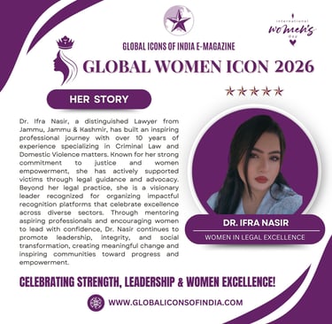 Dr. Ifra Nasir, a distinguished Lawyer from Jammu, Jammu & Kashmir, has built an inspiring professional journey with over 10 years of experience specializing in Criminal Law and Domestic Violence matters. Known for her strong commitment to justice and women empowerment, she has actively supported victims through legal guidance and advocacy. Beyond her legal practice, she is a visionary leader recognized for organizing impactful recognition platforms that celebrate excellence across diverse sectors. Through mentoring aspiring professionals and encouraging women to lead with confidence, Dr. Nasir continues to promote leadership, integrity, and social transformation, creating meaningful change and inspiring communities toward progress and empowerment.