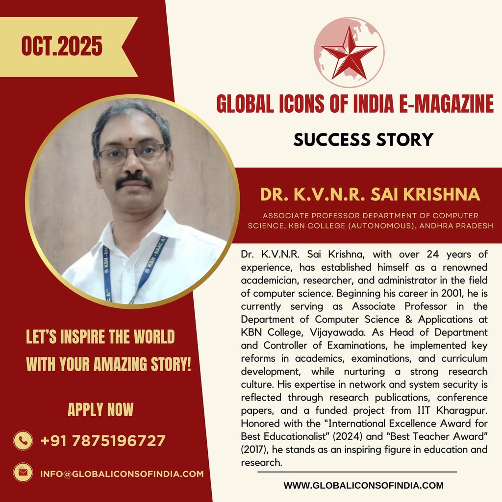 Dr. K.V.N.R. Sai Krishna, with over 24 years of experience, has established himself as a renowned academician, researcher, and administrator in the field of computer science. Beginning his career in 2001, he is currently serving as Associate Professor in the Department of Computer Science & Applications at KBN College, Vijayawada. As Head of Department and Controller of Examinations, he implemented key reforms in academics, examinations, and curriculum development, while nurturing a strong research culture. His expertise in network and system security is reflected through research publications, conference papers, and a funded project from IIT Kharagpur. Honored with the “International Excellence Award for Best Educationalist” (2024) and “Best Teacher Award” (2017), he stands as an inspiring figure in education and research.