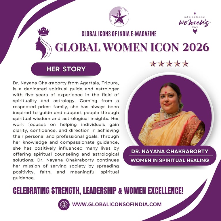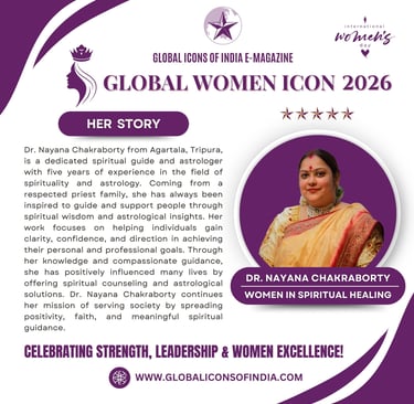 Dr. Nayana Chakraborty from Agartala, Tripura, is a dedicated spiritual guide and astrologer with five years of experience in the field of spirituality and astrology. Coming from a respected priest family, she has always been inspired to guide and support people through spiritual wisdom and astrological insights. Her work focuses on helping individuals gain clarity, confidence, and direction in achieving their personal and professional goals. Through her knowledge and compassionate guidance, she has positively influenced many lives by offering spiritual counseling and astrological solutions. Dr. Nayana Chakraborty continues her mission of serving society by spreading positivity, faith, and meaningful spiritual guidance.