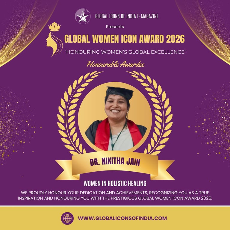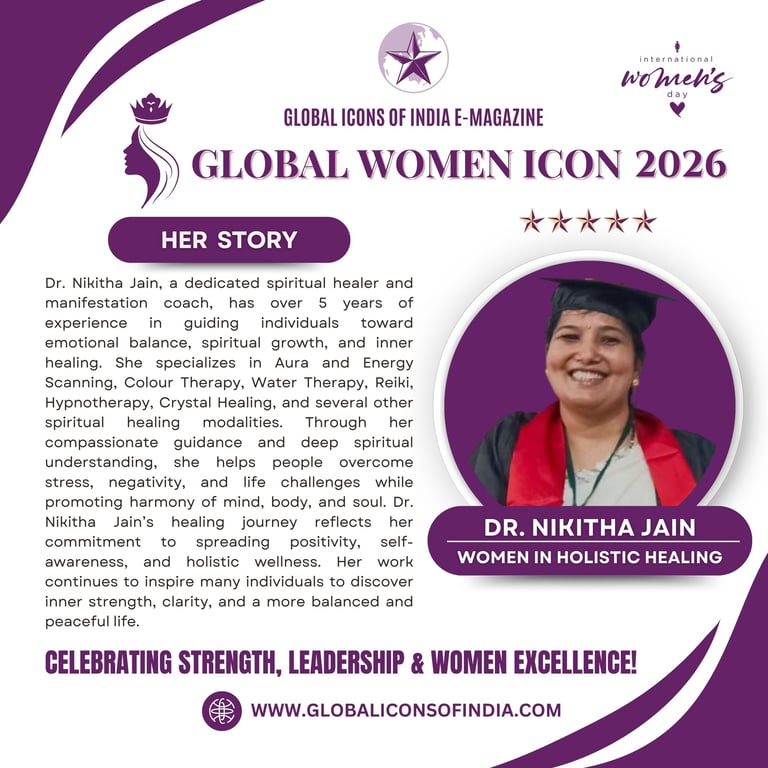 Dr. Nikitha Jain, a dedicated spiritual healer and manifestation coach, has over 5 years of experience in guiding individuals toward emotional balance, spiritual growth, and inner healing. She specializes in Aura and Energy Scanning, Colour Therapy, Water Therapy, Reiki, Hypnotherapy, Crystal Healing, and several other spiritual healing modalities. Through her compassionate guidance and deep spiritual understanding, she helps people overcome stress, negativity, and life challenges while promoting harmony of mind, body, and soul. Dr. Nikitha Jain’s healing journey reflects her commitment to spreading positivity, self-awareness, and holistic wellness. Her work continues to inspire many individuals to discover inner strength, clarity, and a more balanced and peaceful life.