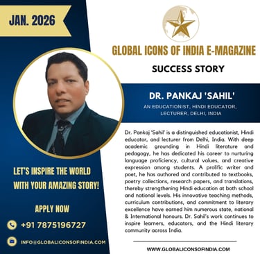 Dr. Pankaj ‘Sahil’ is a distinguished educationist, Hindi educator, and lecturer from Delhi, India. With deep academic grounding in Hindi literature and pedagogy, he has dedicated his career to nurturing language proficiency, cultural values, and creative expression among students. A prolific writer and poet, he has authored and contributed to textbooks, poetry collections, research papers, and translations, thereby strengthening Hindi education at both school and national levels. His innovative teaching methods, curriculum contributions, and commitment to literary excellence have earned him numerous state, national & International honours. Dr. Sahil’s work continues to inspire learners, educators, and the Hindi literary community across India.
