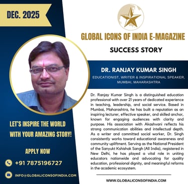 Dr. Ranjay Kumar Singh is a distinguished education professional with over 21 years of dedicated experience in teaching, leadership, and social service. Based in Mumbai, Maharashtra, he has built a reputation as an inspiring lecturer, effective speaker, and skilled anchor, known for engaging audiences with clarity and purpose. His association with Akashvani reflects his strong communication abilities and intellectual depth. As a writer and committed social worker, Dr. Singh consistently works toward educational awareness and community upliftment. Serving as the National President of the Sanyukt Kshishak Sangh (All India), registered in New Delhi, he has played a vital role in uniting educators nationwide and advocating for quality education, professional dignity, and meaningful reforms in the academic ecosystem.