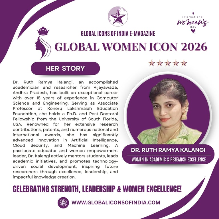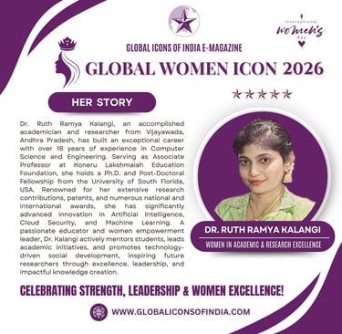 Dr. Ruth Ramya Kalangi, an accomplished academician and researcher from Vijayawada, Andhra Pradesh, has built an exceptional career with over 18 years of experience in Computer Science and Engineering. Serving as Associate Professor at Koneru Lakshmaiah Education Foundation, she holds a Ph.D. and Post-Doctoral Fellowship from the University of South Florida, USA. Renowned for her extensive research contributions, patents, and numerous national and international awards, she has significantly advanced innovation in Artificial Intelligence, Cloud Security, and Machine Learning. A passionate educator and women empowerment leader, Dr. Kalangi actively mentors students, leads academic initiatives, and promotes technology-driven social development, inspiring future researchers through excellence, leadership, and impactful knowledge creation.