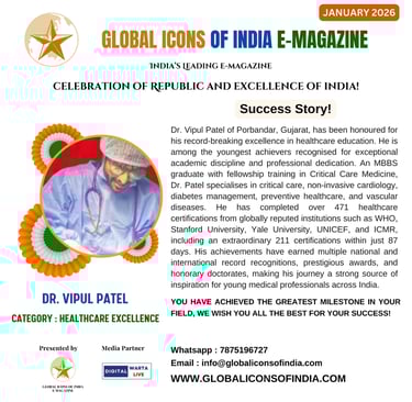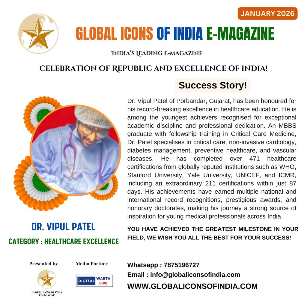 Dr. Vipul Patel of Porbandar, Gujarat, has been honoured for his record-breaking excellence in healthcare education. He is among the youngest achievers recognised for exceptional academic discipline and professional dedication. An MBBS graduate with fellowship training in Critical Care Medicine, Dr. Patel specialises in critical care, non-invasive cardiology, diabetes management, preventive healthcare, and vascular diseases. He has completed over 471 healthcare certifications from globally reputed institutions such as WHO, Stanford University, Yale University, UNICEF, and ICMR, including an extraordinary 211 certifications within just 87 days. His achievements have earned multiple national and international record recognitions, prestigious awards, and honorary doctorates, making his journey a strong source of inspiration for young medical professionals across India.