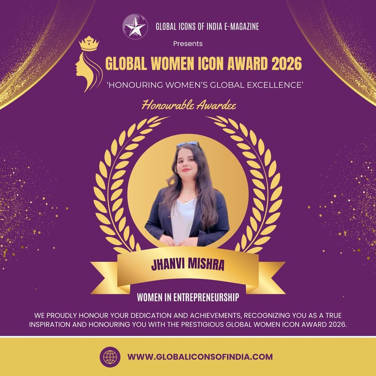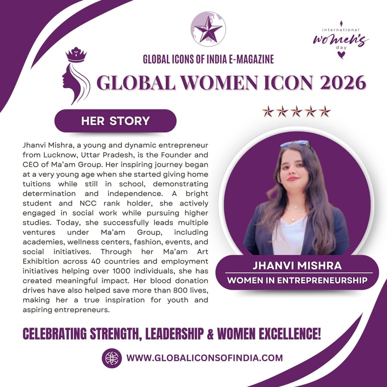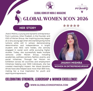 Jhanvi Mishra, a young and dynamic entrepreneur from Lucknow, Uttar Pradesh, is the Founder and CEO of Ma’am Group. Her inspiring journey began at a very young age when she started giving home tuitions while still in school, demonstrating determination and independence. A bright student and NCC rank holder, she actively engaged in social work while pursuing higher studies. Today, she successfully leads multiple ventures under Ma’am Group, including academies, wellness centers, fashion, events, and social initiatives. Through her Ma’am Art Exhibition across 40 countries and employment initiatives helping over 1000 individuals, she has created meaningful impact. Her blood donation drives have also helped save more than 800 lives, making her a true inspiration for youth and aspiring entrepreneurs.