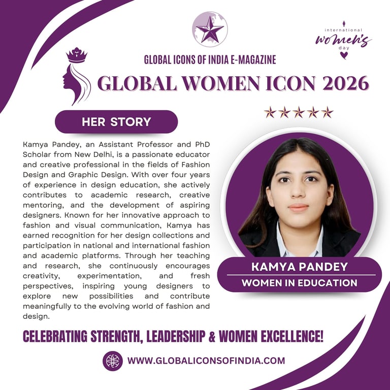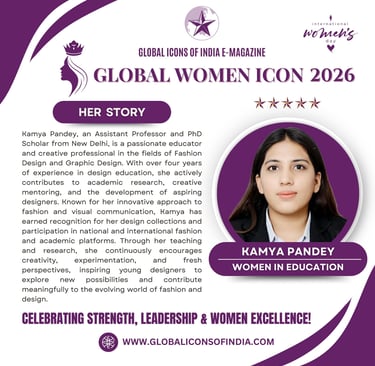 Kamya Pandey, an Assistant Professor and PhD Scholar from New Delhi, is a passionate educator and creative professional in the fields of Fashion Design and Graphic Design. With over four years of experience in design education, she actively contributes to academic research, creative mentoring, and the development of aspiring designers. Known for her innovative approach to fashion and visual communication, Kamya has earned recognition for her design collections and participation in national and international fashion and academic platforms. Through her teaching and research, she continuously encourages creativity, experimentation, and fresh perspectives, inspiring young designers to explore new possibilities and contribute meaningfully to the evolving world of fashion and design.