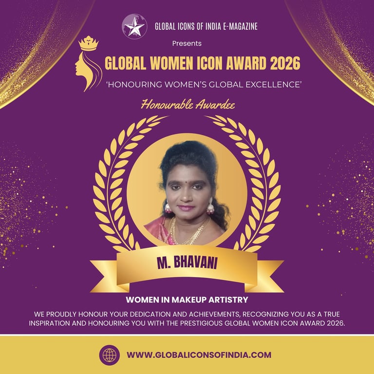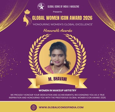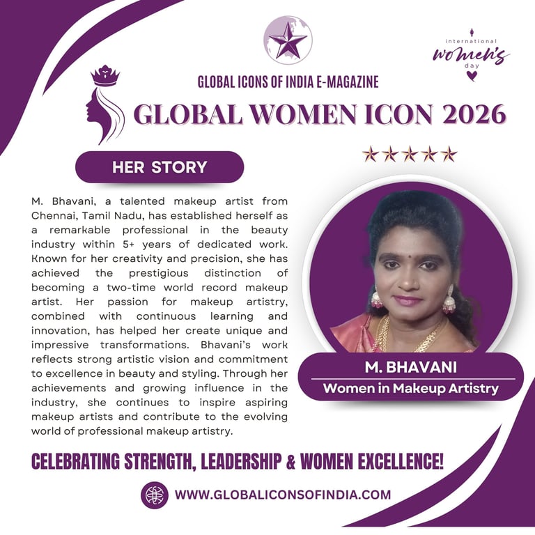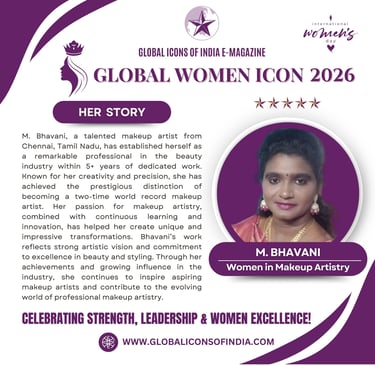 M. Bhavani, a talented makeup artist from Chennai, Tamil Nadu, has established herself as a remarkable professional in the beauty industry within 4-5 years of dedicated work. Known for her creativity and precision, she has achieved the prestigious distinction of becoming a two-time world record makeup artist. Her passion for makeup artistry, combined with continuous learning and innovation, has helped her create unique and impressive transformations. Bhavani’s work reflects strong artistic vision and commitment to excellence in beauty and styling. Through her achievements and growing influence in the industry, she continues to inspire aspiring makeup artists and contribute to the evolving world of professional makeup artistry.