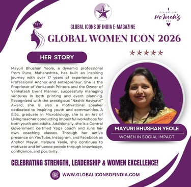 Mayuri Bhushan Yeole, a dynamic professional from Pune, Maharashtra, has built an inspiring journey with over 17 years of experience as a Professional Anchor and entrepreneur. She is the Proprietor of Venkatesh Printers and the Owner of Venkatesh Event Planner, successfully managing ventures in both printing and event planning. Recognized with the prestigious “Nashik Kaviyatri” Award, she is also a motivational speaker dedicated to inspiring youth and communities. A B.Sc. graduate in Microbiology, she is an Art of Living teacher conducting impactful workshops for both youth and adults. Additionally, she is a Central Government certified Yoga coach and runs her own coaching classes. Through her active presence on YouTube, Instagram, and Facebook as Anchor Mayuri Malpure Yeole, she continues to motivate and influence people through knowledge, confidence, and positivity.