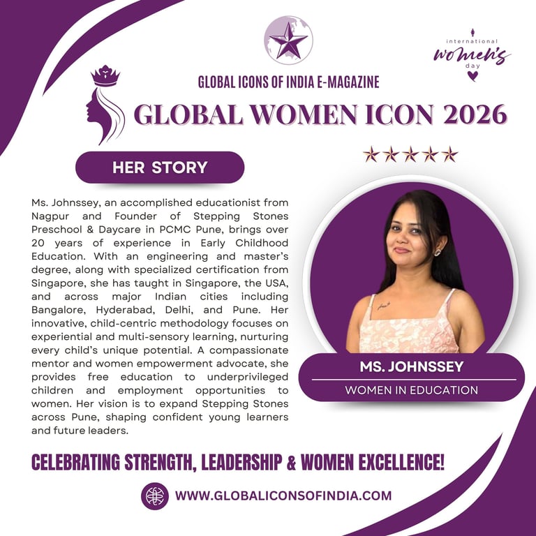 Ms. Johnssey, an accomplished educationist from Nagpur and Founder of Stepping Stones Preschool & Daycare in PCMC Pune, brings over 20 years of experience in Early Childhood Education. With an engineering and master’s degree, along with specialized certification from Singapore, she has taught in Singapore, the USA, and across major Indian cities including Bangalore, Hyderabad, Delhi, and Pune. Her innovative, child-centric methodology focuses on experiential and multi-sensory learning, nurturing every child’s unique potential. A compassionate mentor and women empowerment advocate, she provides free education to underprivileged children and employment opportunities to women. Her vision is to expand Stepping Stones across Pune, shaping confident young learners and future leaders.