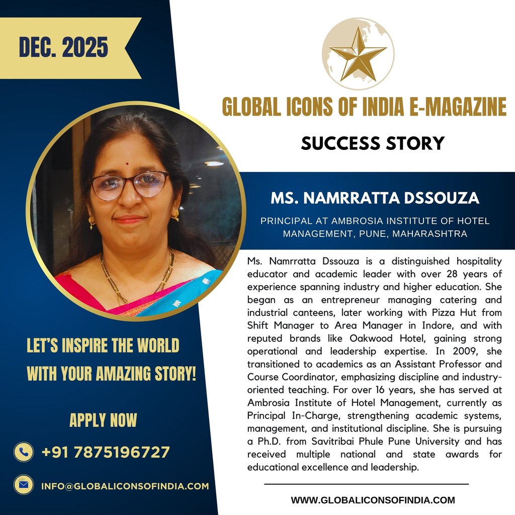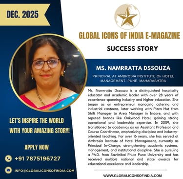 Ms. Namrratta Dssouza is a distinguished hospitality educator and academic leader with over 28 years of experience spanning industry and higher education. She began as an entrepreneur managing catering and industrial canteens, later working with Pizza Hut from Shift Manager to Area Manager in Indore, and with reputed brands like Oakwood Hotel, gaining strong operational and leadership expertise. In 2009, she transitioned to academics as an Assistant Professor and Course Coordinator, emphasizing discipline and industry-oriented teaching. For over 16 years, she has served at Ambrosia Institute of Hotel Management, currently as Principal In-Charge, strengthening academic systems, management, and institutional discipline. She is pursuing a Ph.D. from Savitribai Phule Pune University and has received multiple national and state awards for educational excellence and leadership.