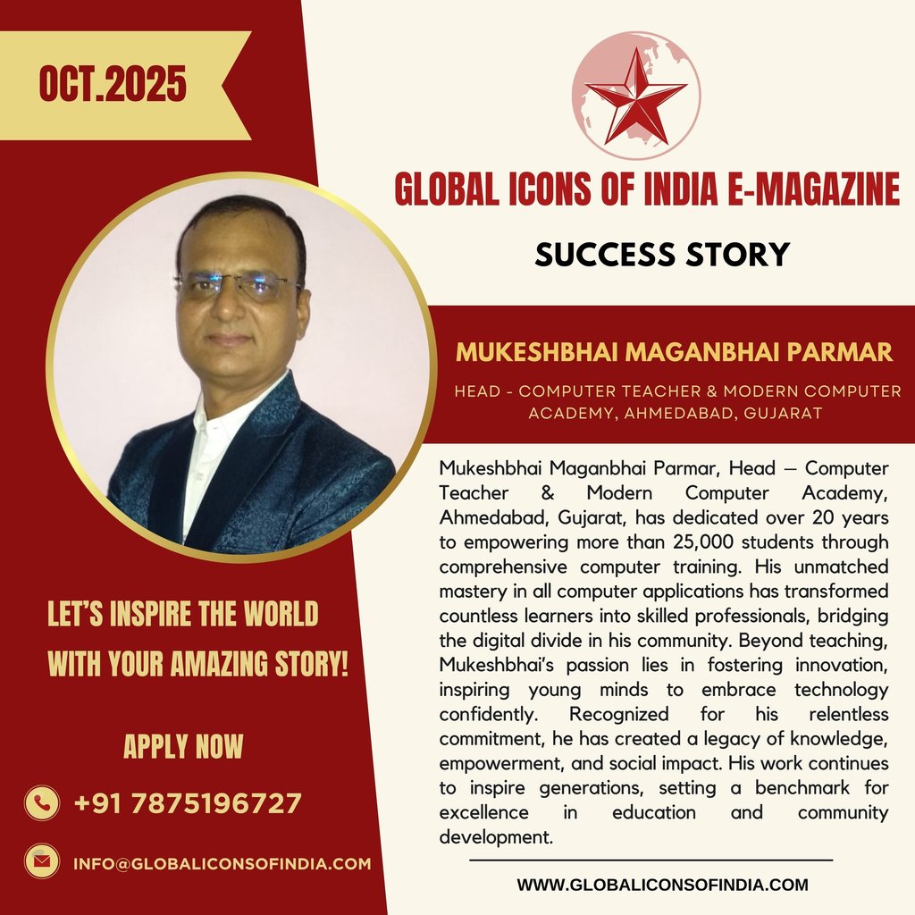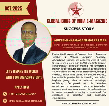 Mukeshbhai Maganbhai Parmar, Head – Computer Teacher & Modern Computer Academy, Ahmedabad, Gujarat, has dedicated over 20 years to empowering more than 25,000 students through comprehensive computer training. His unmatched mastery in all computer applications has transformed countless learners into skilled professionals, bridging the digital divide in his community. Beyond teaching, Mukeshbhai’s passion lies in fostering innovation, inspiring young minds to embrace technology confidently. Recognized for his relentless commitment, he has created a legacy of knowledge, empowerment, and social impact. His work continues to inspire generations, setting a benchmark for excellence in education and community development.