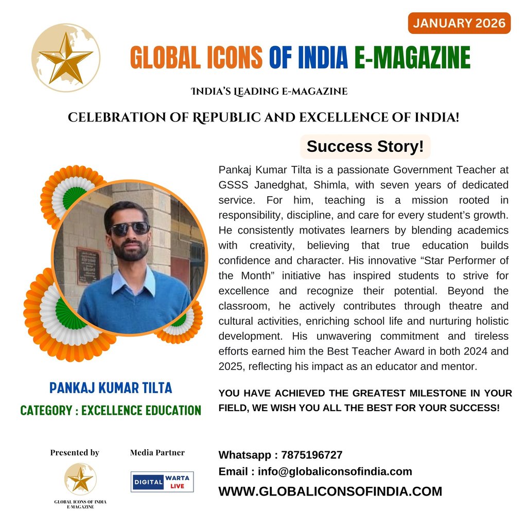 Pankaj Kumar Tilta is a passionate Government Teacher at GSSS Janedghat, Shimla, with seven years of dedicated service. For him, teaching is a mission rooted in responsibility, discipline, and care for every student’s growth. He consistently motivates learners by blending academics with creativity, believing that true education builds confidence and character. His innovative “Star Performer of the Month” initiative has inspired students to strive for excellence and recognize their potential. Beyond the classroom, he actively contributes through theatre and cultural activities, enriching school life and nurturing holistic development. His unwavering commitment and tireless efforts earned him the Best Teacher Award in both 2024 and 2025, reflecting his impact as an educator and mentor.
