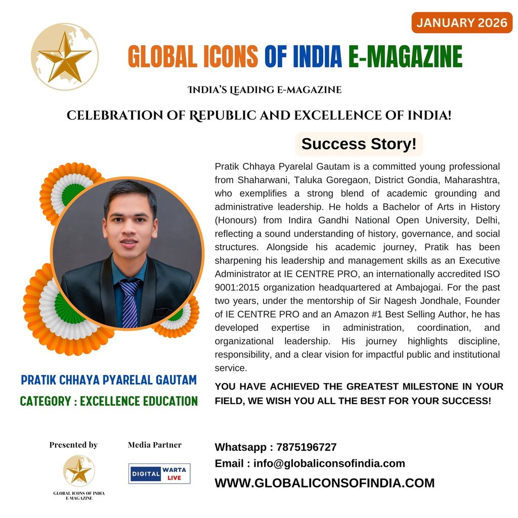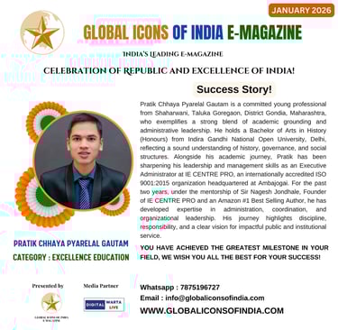 Pratik Chhaya Pyarelal Gautam is a committed young professional from Shaharwani, Taluka Goregaon, District Gondia, Maharashtra, who exemplifies a strong blend of academic grounding and administrative leadership. He holds a Bachelor of Arts in History (Honours) from Indira Gandhi National Open University, Delhi, reflecting a sound understanding of history, governance, and social structures. Alongside his academic journey, Pratik has been sharpening his leadership and management skills as an Executive Administrator at IE CENTRE PRO, an internationally accredited ISO 9001:2015 organization headquartered at Ambajogai. For the past two years, under the mentorship of Sir Nagesh Jondhale, Founder of IE CENTRE PRO and an Amazon #1 Best Selling Author, he has developed expertise in administration, coordination, and organizational leadership. His journey highlights discipline, responsibility, and a clear vision for impactful public and institutional service.
