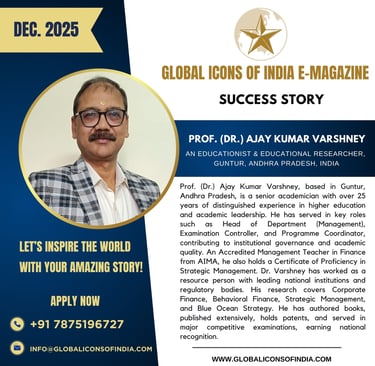 Prof. (Dr.) Ajay Kumar Varshney, based in Guntur, Andhra Pradesh, is a senior academician with over 25 years of distinguished experience in higher education and academic leadership. He has served in key roles such as Head of Department (Management), Examination Controller, and Programme Coordinator, contributing to institutional governance and academic quality. An Accredited Management Teacher in Finance from AIMA, he also holds a Certificate of Proficiency in Strategic Management. Dr. Varshney has worked as a resource person with leading national institutions and regulatory bodies. His research covers Corporate Finance, Behavioral Finance, Strategic Management, and Blue Ocean Strategy. He has authored books, published extensively, holds patents, and served in major competitive examinations, earning national recognition.