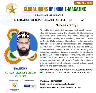 Riyajuddin is a dedicated educator and social reformer who has devoted nearly two decades to strengthening education and promoting the Urdu language in Chhattisgarh. Serving as a Teacher (UDT) and currently as District Urdu Incharge, Kabirdham, he has played a vital role in academic administration and grassroots outreach. With diverse qualifications across arts, science, IT, and Urdu education, he blends modern learning with cultural preservation. His most remarkable contribution is guiding 1,075 school dropouts—boys, girls, and women—back into formal education. Honoured with multiple national and international awards, Riyajuddin continues to serve society through education, social welfare, blood donation, and community leadership.