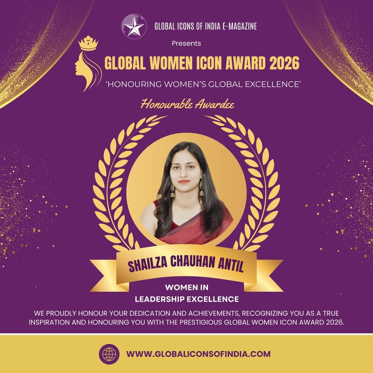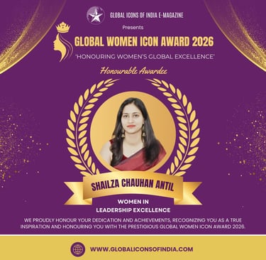 Shailza Chauhan Antil from Sonipat, Haryana, is one of India’s most recognized and dynamic personalities, known for her impactful contributions across multiple professional and social domains. With over 11 years of diverse experience, she began her career in teaching and later advanced into administrative services, working under various ministries in liaisoning, expansion, and business consultancy with leading real estate organizations. Passionate about national development and youth empowerment, she actively inspires women to build independent and confident identities. A celebrated motivational speaker and social activist for the past four years, she has received over 150+ national and international awards, including Mrs. Haryana 2022, Mrs. Venus Universe 2022, National Youth Icon 2022, International Human Rights Activist 2025, and Global Woman Icon 2025-2026.