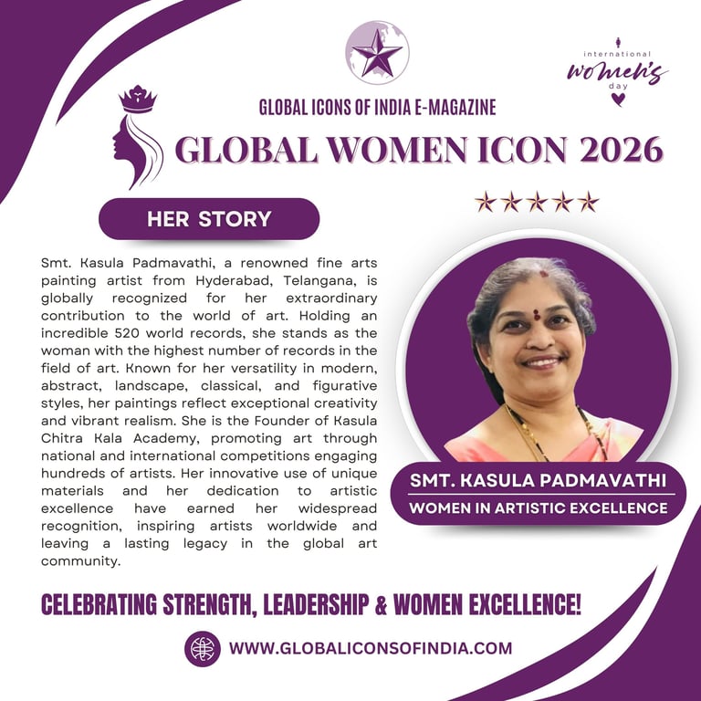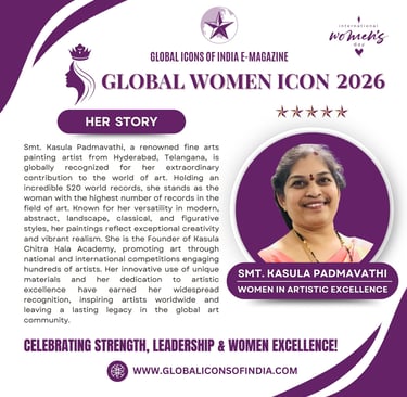 Smt. Kasula Padmavathi, a renowned fine arts painting artist from Hyderabad, Telangana, is globally recognized for her extraordinary contribution to the world of art. Holding an incredible 520 world records, she stands as the woman with the highest number of records in the field of art. Known for her versatility in modern, abstract, landscape, classical, and figurative styles, her paintings reflect exceptional creativity and vibrant realism. She is the Founder of Kasula Chitra Kala Academy, promoting art through national and international competitions engaging hundreds of artists. Her innovative use of unique materials and her dedication to artistic excellence have earned her widespread recognition, inspiring artists worldwide and leaving a lasting legacy in the global art community.