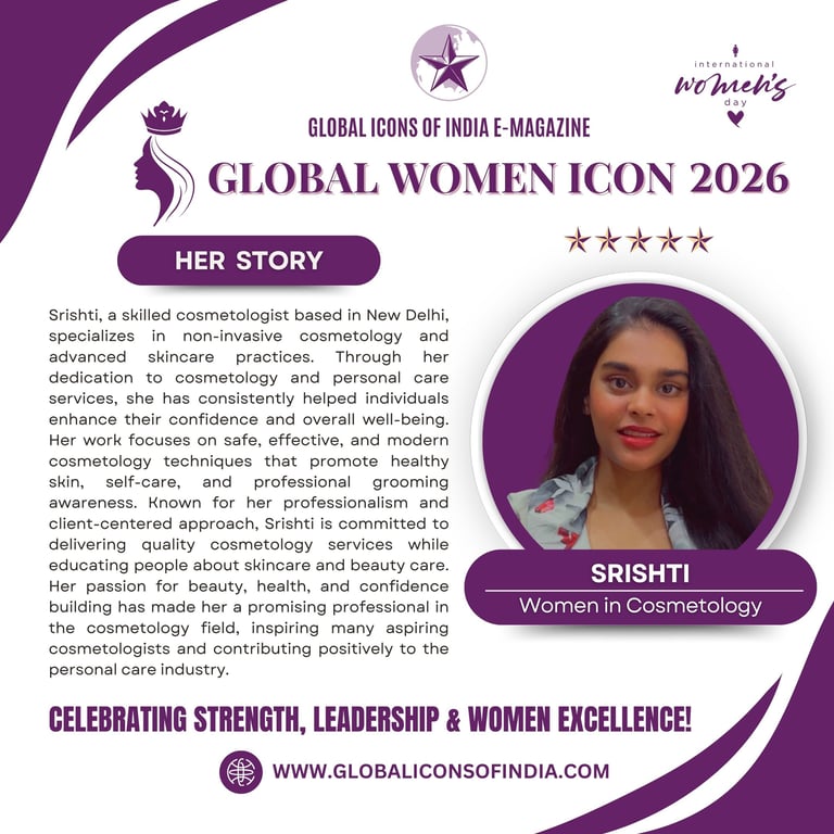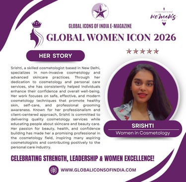 Srishti, a skilled cosmetologist based in New Delhi, specializes in non-invasive cosmetology and advanced skincare practices. Through her dedication to cosmetology and personal care services, she has consistently helped individuals enhance their confidence and overall well-being. Her work focuses on safe, effective, and modern cosmetology techniques that promote healthy skin, self-care, and professional grooming awareness. Known for her professionalism and client-centered approach, Srishti is committed to delivering quality cosmetology services while educating people about skincare and beauty care. Her passion for beauty, health, and confidence building has made her a promising professional in the cosmetology field, inspiring many aspiring cosmetologists and contributing positively to the personal care industry.